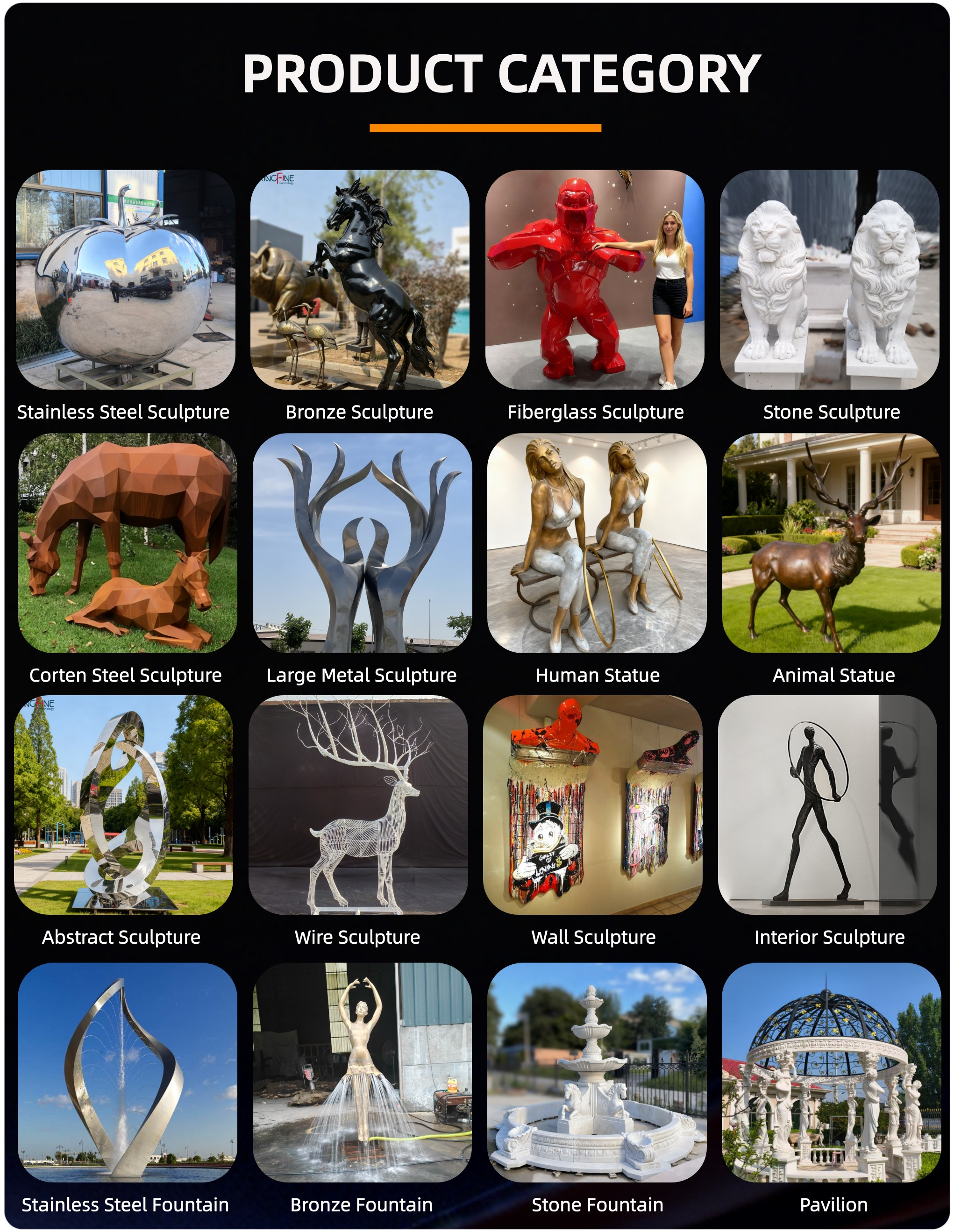 Main categories: Bronze Sculptures, Stainless Steel Sculptures, Marble Sculptures, Fiberglass Sculptures, Water Fountains